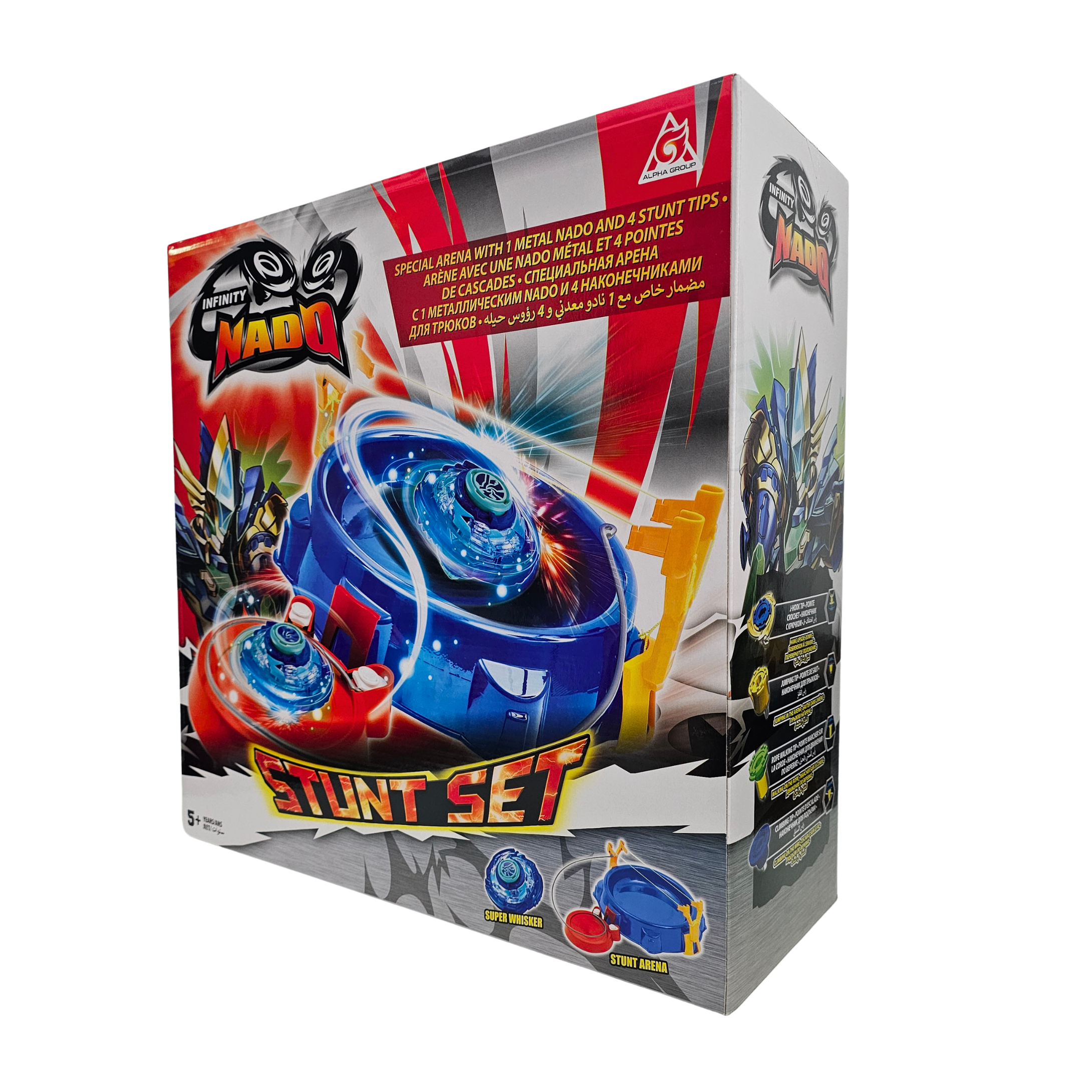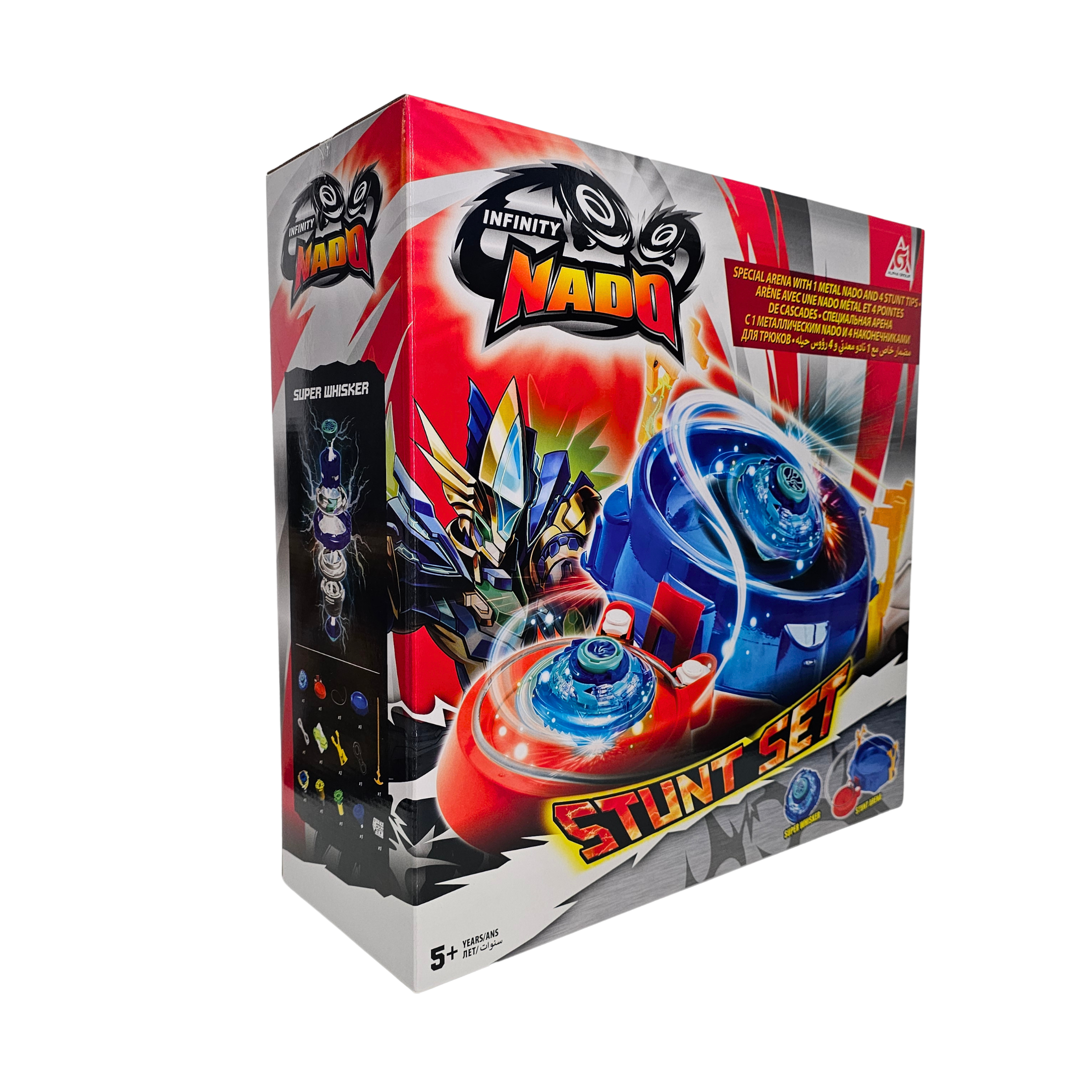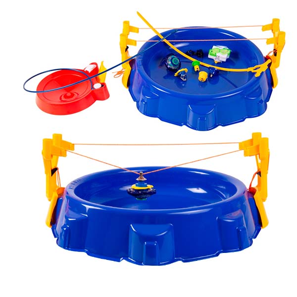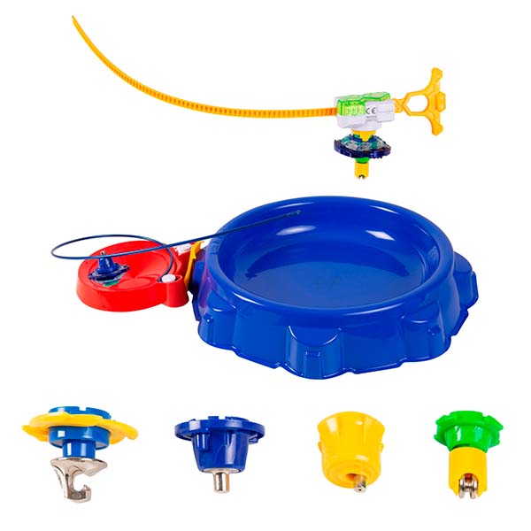 Only with the big set for blade tricks, you can unleash the full potential of Infinity Nado spinning tops! Unique rope and spiral projectile inside: change the tip, and your spinning top can walk on the rope or spin on it upside down, jump around the arena, slide on the metal spiral.
